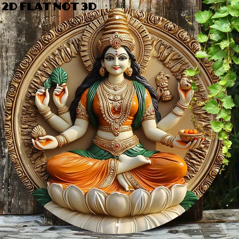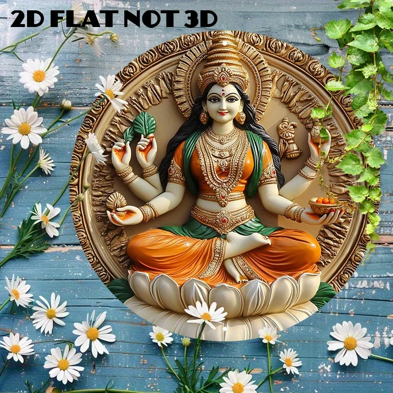 2D Flat Round Aluminum Wall Art Decor - Laxmi Goddess on For Lotus, Vibrant Hindu Deity Design, Religious, Indian Home Decor